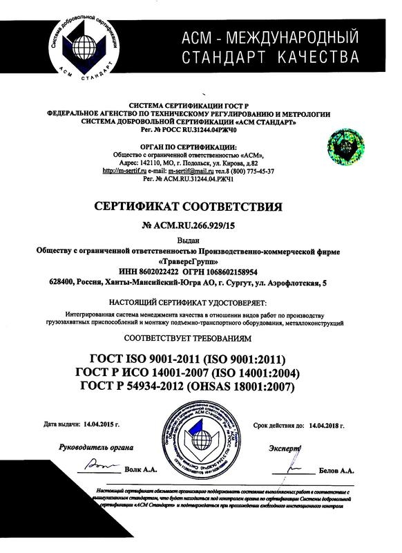 Производство грузозахватных приспособлений и подъемно-транспортного оборудования, такелажных изделий по ГОСТ, ОСТ и ТУ.